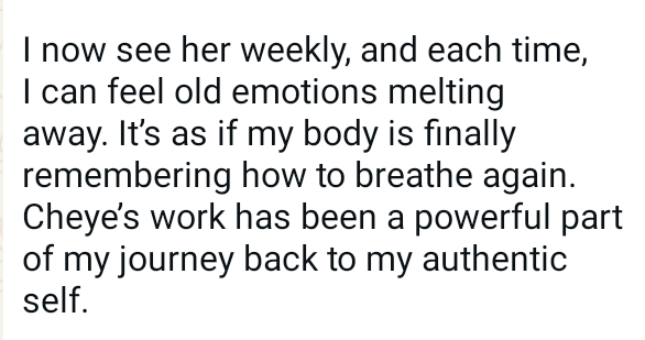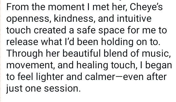These sessions are an invitation to slow down, come back into your body, and be deeply held. Each offering is designed to support your nervous system, release stored stress, and help you reconnect with yourself on a physical, emotional and energetic level. This is personalised, intuitive healing for women who are tired of pushing and ready to receive.